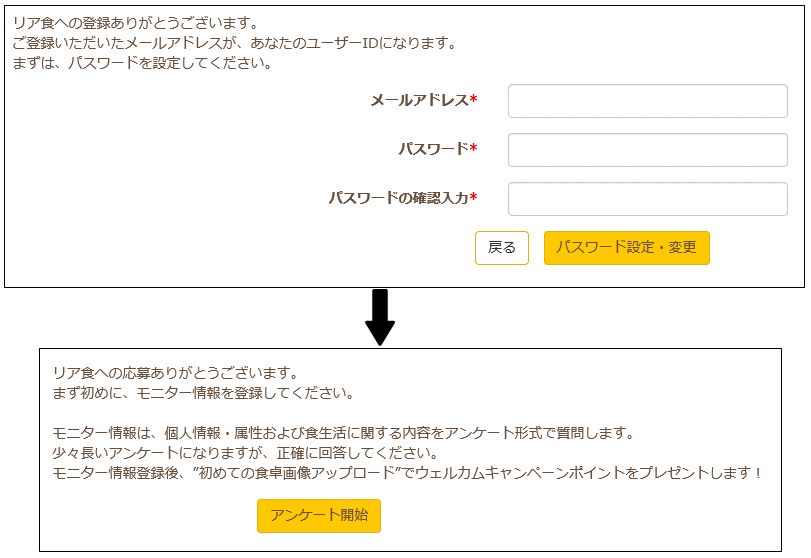 以上を記載して送信すると仮登録メールが送られてきますので次は本登録に入ります。この時点では『リア食』に住所や電話番号等の重要な個人情報を抜かれる事はございません。次に送られてきたメールをクリックしてパスワードを設定してモニター情報の登録へと移ります。