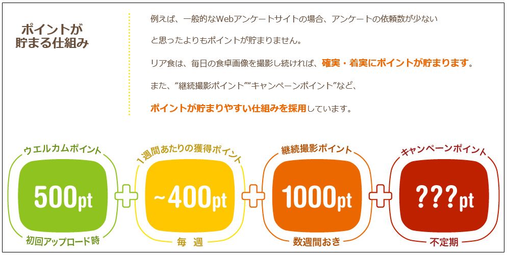 リア食は、毎日の食卓画像を撮影し続ければ、確実・着実にポイントが貯まります。また、“継続撮影ポイント”や“キャンペーンポイント”など、ポイントが貯まりやすい仕組みを採用しています。